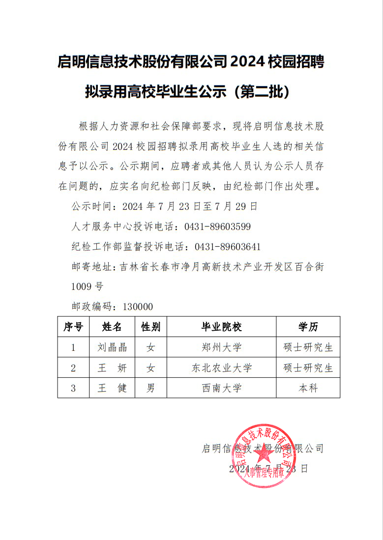 710公海寰宇信息技术股份有限公司2024校园招聘拟录用高校毕业生公示(第二批)