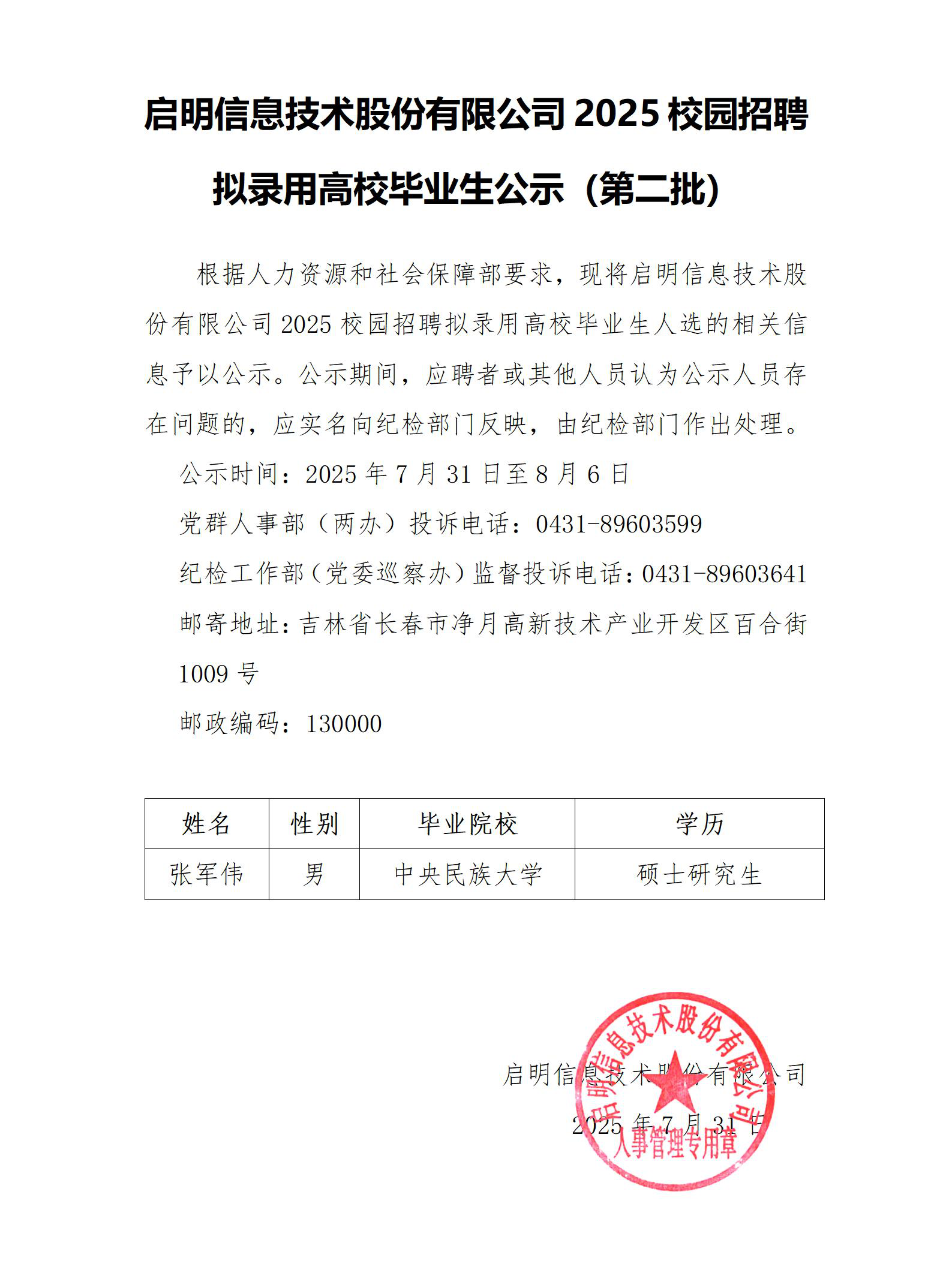 710公海寰宇信息技术股份有限公司2025校园招聘拟录用高校毕业生公示(第二批)